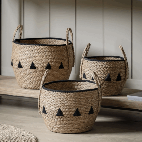 Set of three characterful hand crafted baskets, with a weave mixed with a black triangular design embellishment.
